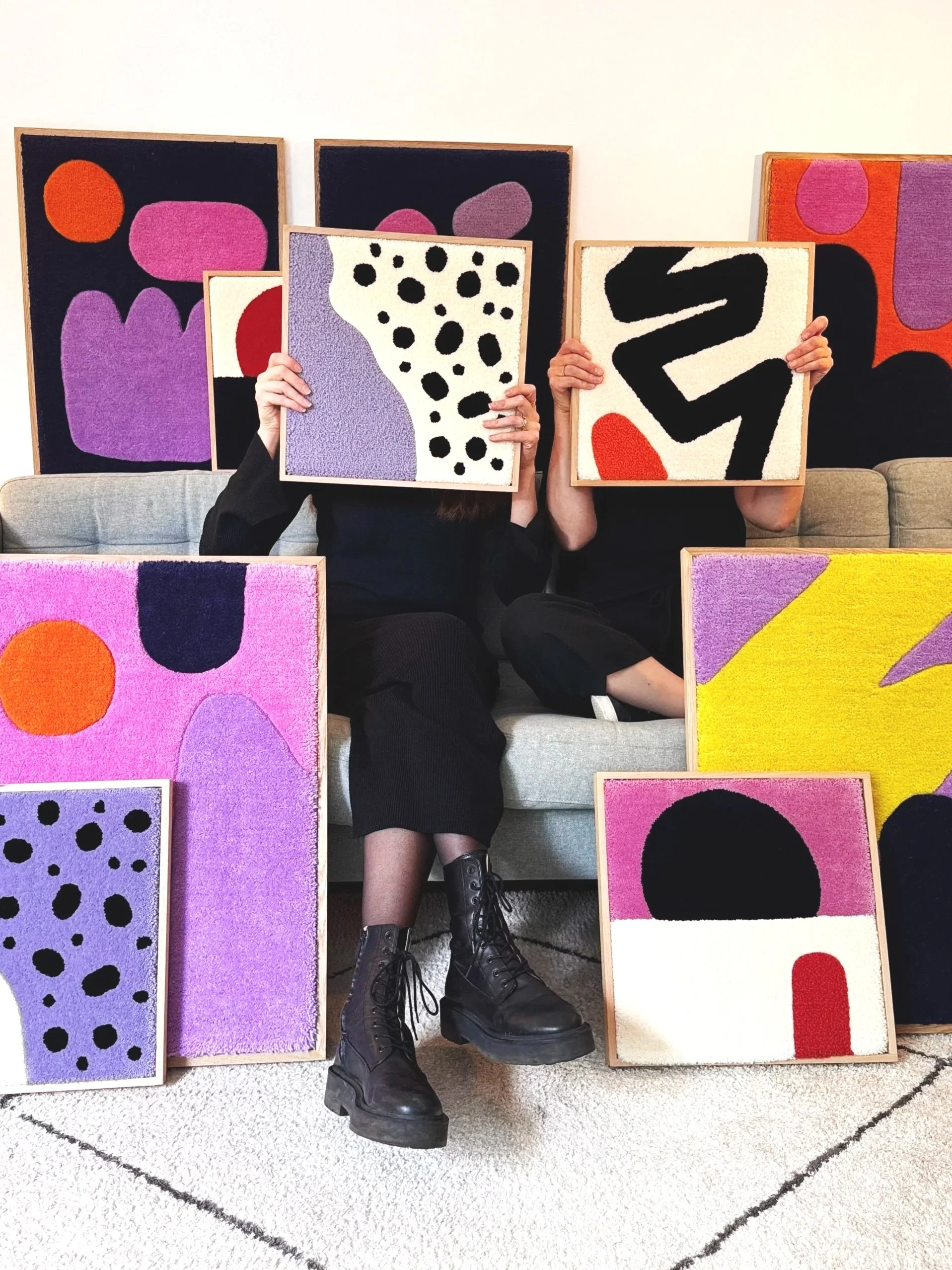 Unsere Wandteppiche entstehen in enger Zusammenarbeit mit einem kleinen Betrieb in Nordindien. Dort wird jeder Teppich von Hand getuftet – eine aufwendige Technik, bei der mit einer Tufting-Pistole Wollfäden präzise in ein Trägergewebe geschossen werden.